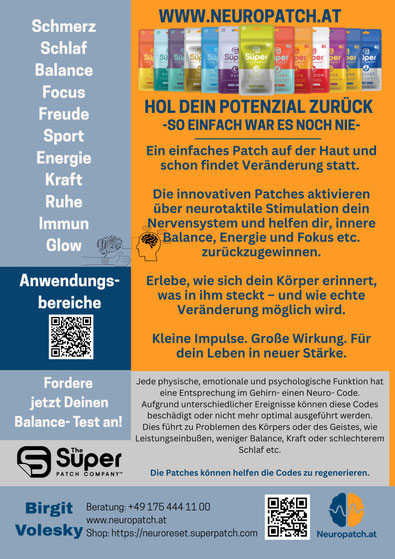 Eine neue Technologie (in Form eines Patches) zur Unterstützung von Sport und Fitness, Wohlbefinden und Leistungsfähigkeit wird durch unser Netzwerk in Europa eingeführt. Technologie klingt vielleicht im ersten Eindruck sehr kompliziert, aber es ist ganz einfach. Mit ihren Rezeptoren ist die Haut ein großes Sinnesorgan. Die Rezeptoren wirken über Neurotransmitter direkt auf das Gehirn. So können wir die persönliche Leistungsfähigkeit unterstützen. Ganz einfach,